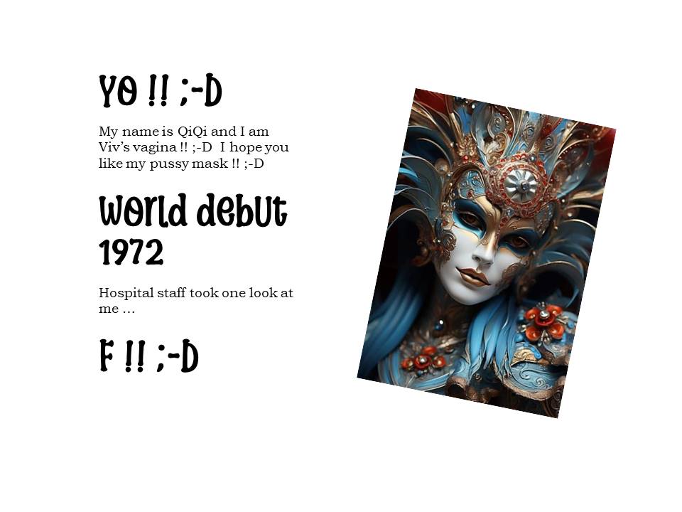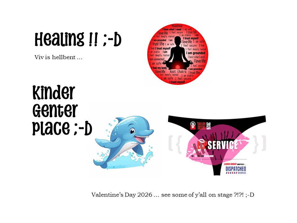 Viv identifies as a California Beach Bum, a “7” on the Enneagram, an Aquarius, and a Hot Messy GenX’r !! ;-D Viv’s vagina — QiQi 氣氣 — will tell a personal story inspired by Eve Enslers’s THE VAGINA MONOLOGUES. She hopes to inspire other local vaginas to also get cozy w/ a microhone … and engage in some well-deserved Lip Service … maybe on Valentine’s Day 2026 … ?! Here’s Viv w/ her story entitled: “I know why the Caged Wife sings” !! ;-D